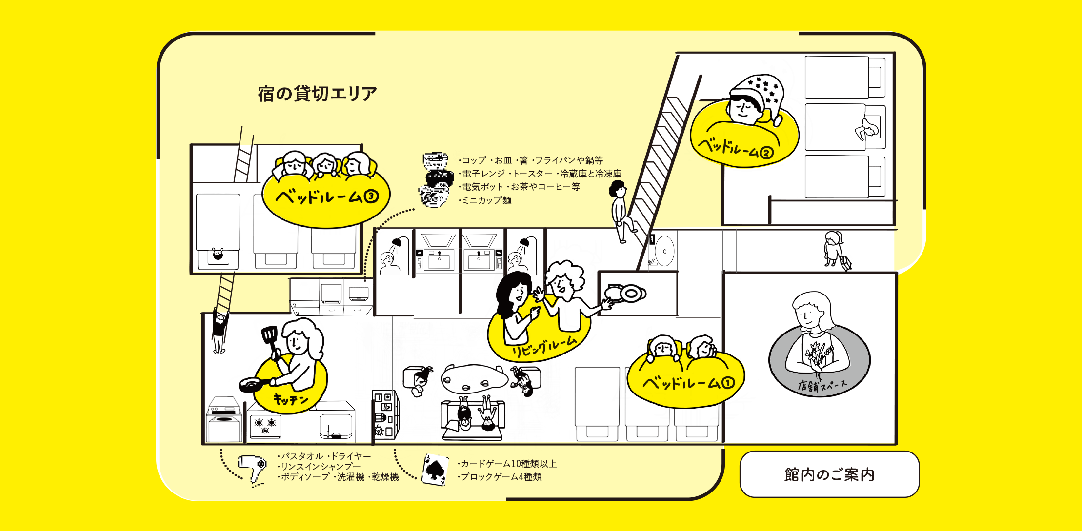 ご宿泊のお客様が、気兼ねなくリビングで楽しそうに会話をしていただけたらと思い、ワイワイできるゲームを各種ご用意させていただいております。小腹を満たすミニカップ麵やお茶・コーヒーなどのフリードリンクもご用意していますので、宿での時間を皆様でお楽しみください。