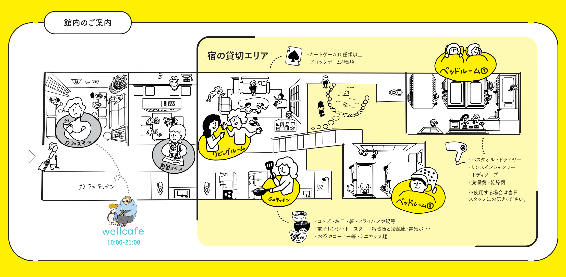 ご宿泊のお客様が、気兼ねなくリビングで楽しそうに会話をしていただけたらと思い、ワイワイできるゲームを各種ご用意させていただいております。小腹を満たすミニカップ麵やお茶・コーヒーなどのフリードリンクもご用意していますので、宿での時間を皆様でお楽しみください。